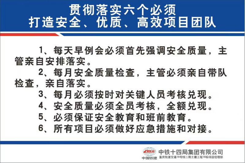 在施工進(jìn)入下半場攻堅階段,為推進(jìn)精細(xì)化管理落地生根,安全優(yōu)質(zhì)高效完成年度目標(biāo)任務(wù)。中鐵建重慶軌道交通15號線二期總承包部16標(biāo)項(xiàng)目部,居安思危時刻繃緊安全主弦,通過創(chuàng)新工程早例會工作手法,積極推行“六個必須”安全管理制度,與會人員通過每早“六個必須”須知須會,進(jìn)一步促進(jìn)了對口工作的一口清和兩手硬,既提高了工程早例會的質(zhì)量,又有效地保證了對施工安全的把控、質(zhì)量的受控和創(chuàng)效的可控。