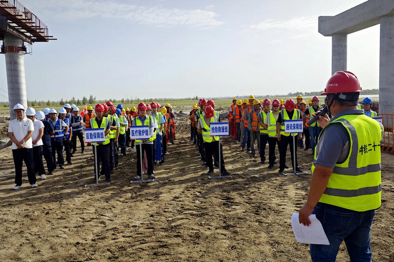 此次應(yīng)急演練情景設(shè)定在阿阿高速項(xiàng)目塔里木河特大橋蓋梁施工現(xiàn)場(chǎng),一名施工人員因未正確系掛安全帶,導(dǎo)致腳下踩空后從高空墜落,造成小腿骨折,面部有外傷出血,情況緊急。“事故”發(fā)生后,作業(yè)現(xiàn)場(chǎng)迅速啟動(dòng)了應(yīng)急響應(yīng)機(jī)制?,F(xiàn)場(chǎng)安全員迅速評(píng)估情況并布置現(xiàn)場(chǎng)警戒,同時(shí)上報(bào)事故。應(yīng)急總指揮依據(jù)事故嚴(yán)重程度,果斷啟動(dòng)應(yīng)急救援預(yù)案,各救援小組按照各組職責(zé)有序開(kāi)展救援行動(dòng),并將現(xiàn)場(chǎng)救援情況實(shí)時(shí)匯報(bào)。