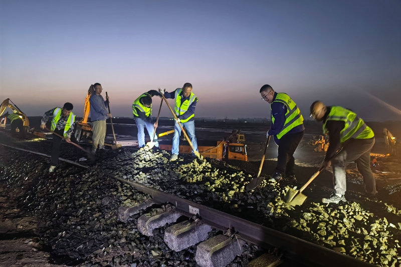 當日0時50分,中鐵二十一局阿阿高速項目部接到中國鐵路烏魯木齊局集團有關部門通知,得知阿克蘇地區(qū)遭遇強降雨,南疆鐵路薩特瑪站至金銀川站間發(fā)生了水害,造成南疆鐵路阿克蘇至喀什段行車中斷,急需幫助救援。了解緊急情況后,中鐵二十一局阿阿高速項目部火速成立搶險救援隊伍,迅速調集人員53名,挖掘機3臺、裝載機3臺、自卸車27臺立即奔赴現(xiàn)場,對水害處開展搶險施工。經(jīng)過與烏魯木齊局集團各站段通力配合,連續(xù)作戰(zhàn)13個小時,順利完成搶險救援任務。