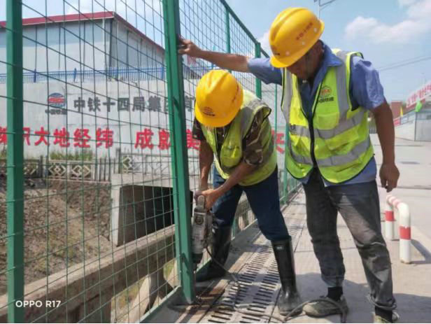 圖一、項(xiàng)目部勤雜工高溫下維護(hù)被大風(fēng)吹偏的施工便道防護(hù)欄