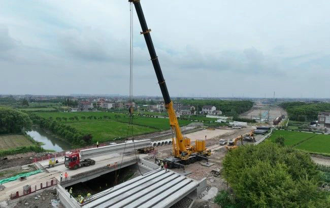 該項(xiàng)目南起大蘆線跨河橋北引橋,北至臨港大道,緊鄰軌道交通16號線書院站,全長約4856米,主要施工任務(wù)包括道路、橋梁、雨污排水管道、水工、照明(含合桿)、監(jiān)控和附屬工程(交通、綠化等)。此次完成架梁的蘇橋河橋長度23米,橋面寬度39米,上部結(jié)構(gòu)形式為空心板梁。