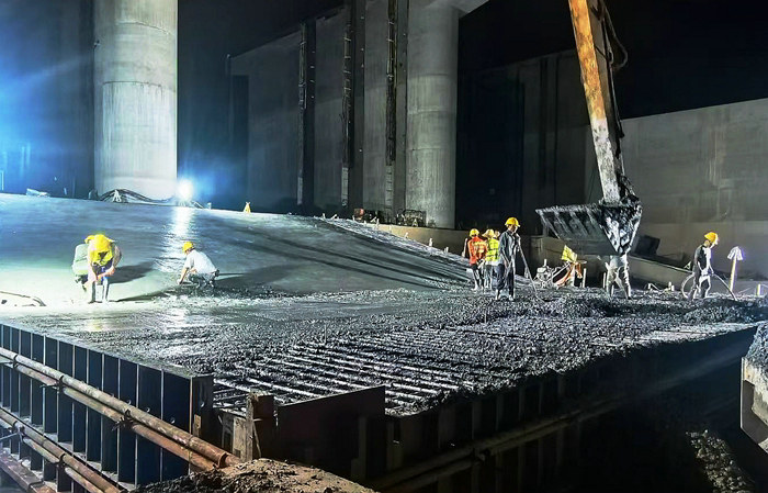 常山江航電樞紐就像人的“五官”,消力池是其中一個(gè)“器官”,從外到內(nèi)不能有瑕疵。在澆注混凝土?xí)r,項(xiàng)目部采取長(zhǎng)臂挖掘機(jī)將自卸車傾倒進(jìn)鋼結(jié)構(gòu)池的混凝土挖運(yùn)至鋼筋網(wǎng)內(nèi),并由人工操持振動(dòng)棒、抹子搗固密實(shí)、抹平。