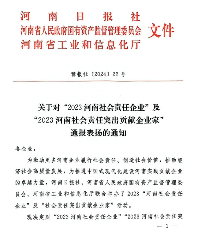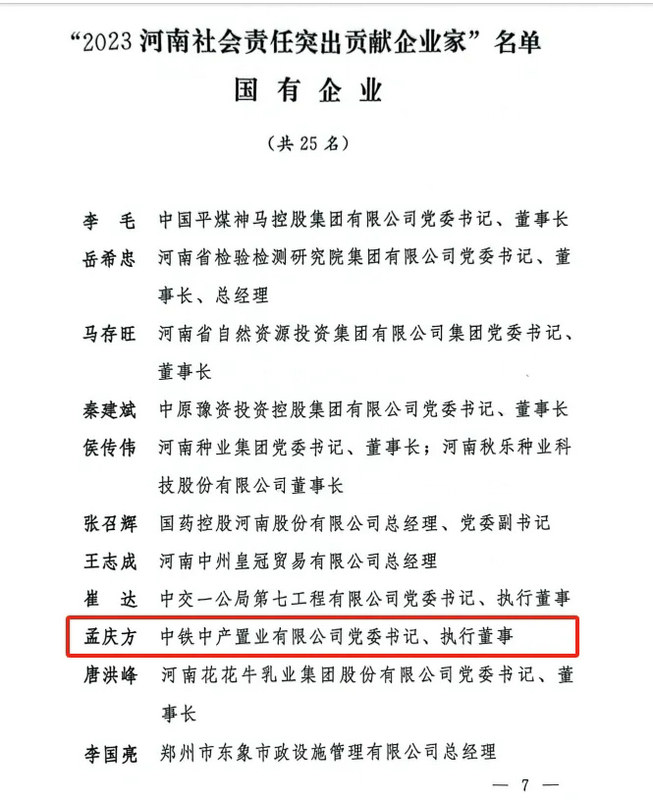 近日,由河南日?qǐng)?bào)社、河南省國(guó)資委、河南省工信廳、河南省社會(huì)科學(xué)院共同主辦,河南日?qǐng)?bào)傳媒公司承辦的“2023河南社會(huì)責(zé)任企業(yè)(企業(yè)家)名單發(fā)布暨2023河南省國(guó)有企業(yè)社會(huì)責(zé)任報(bào)告發(fā)布”活動(dòng)在鄭州黃河迎賓館舉行,中鐵中產(chǎn)置業(yè)公司榮獲“2023河南社會(huì)責(zé)任企業(yè)”稱(chēng)號(hào),公司黨委書(shū)記、執(zhí)行董事孟慶方榮獲“2023河南社會(huì)責(zé)任突出貢獻(xiàn)企業(yè)家”稱(chēng)號(hào)。