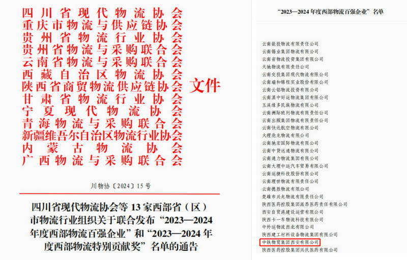 近日,西部十二省市13家物流行業(yè)組織聯(lián)合發(fā)布了2023至2024年度“西部物流百強(qiáng)企業(yè)”名單,中鐵物貿(mào)集團(tuán)西安有限公司榜上有名。