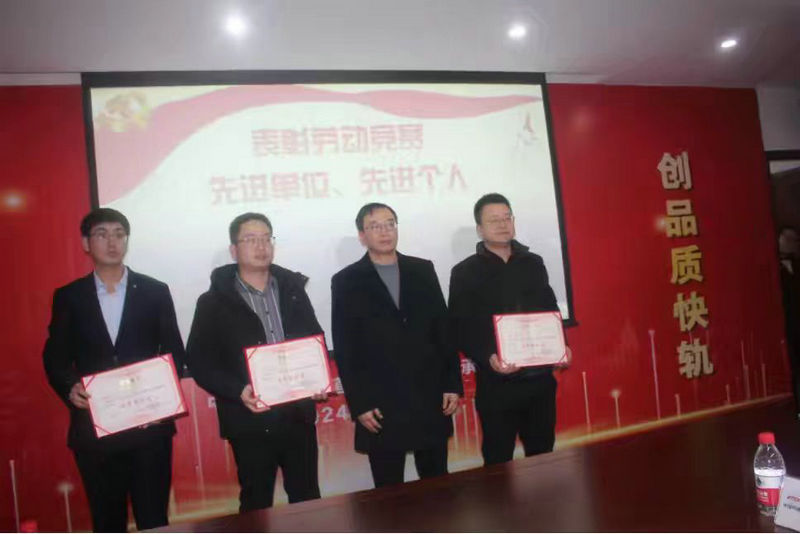 總承包部黨工委書記王向平(右2)給16標(biāo)項(xiàng)目總工程師李文慶(左2)等先進(jìn)個(gè)人頒發(fā)榮譽(yù)證書