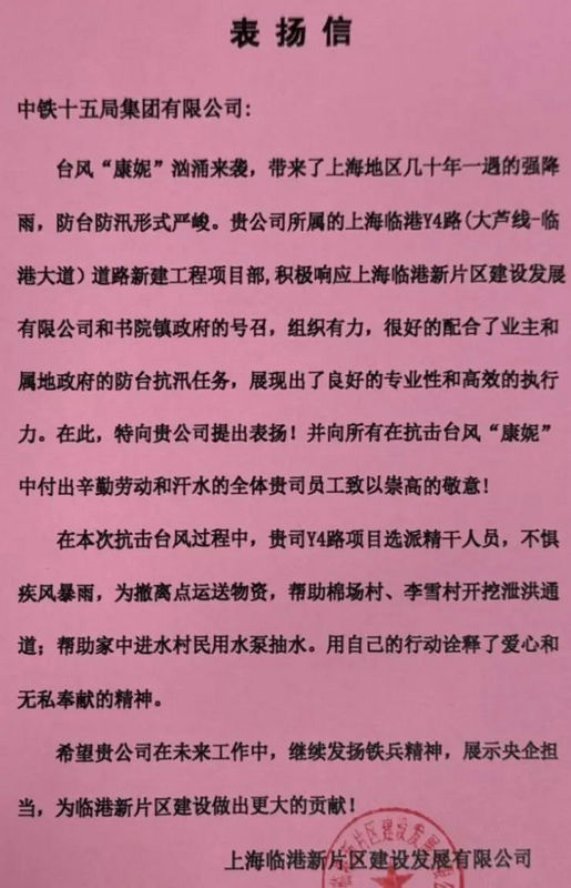 鐵路工程建設(shè)網(wǎng)訊(通訊員 張聰聰)近日,臺風(fēng)“康妮”洶涌來襲,帶來了上海市幾十年難得一遇的強降雨。Y4路項目防臺防汛彰顯央企擔(dān)當,收獲了業(yè)主單位的表揚信。信中對該項目全體參建人員在抗擊臺風(fēng)“康妮”中的辛勤付出表達了衷心的感謝。