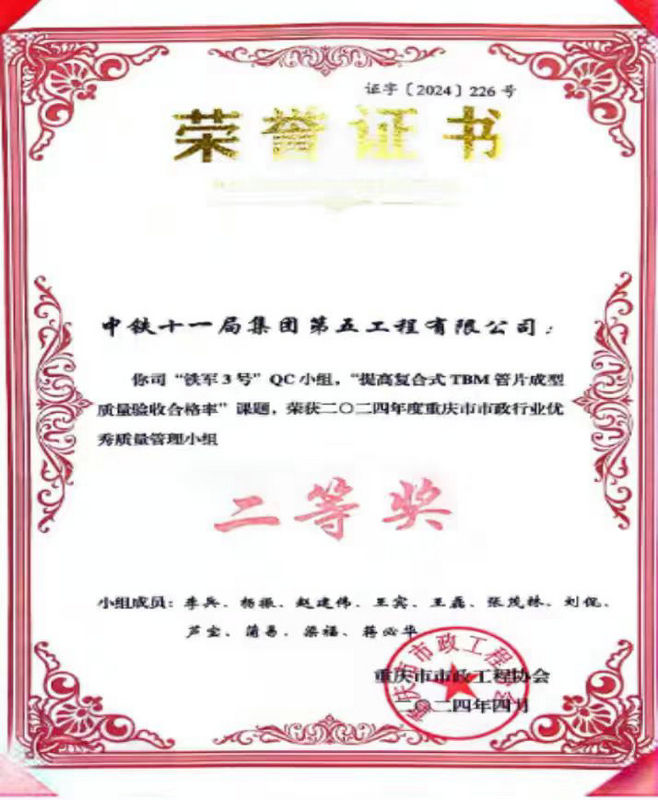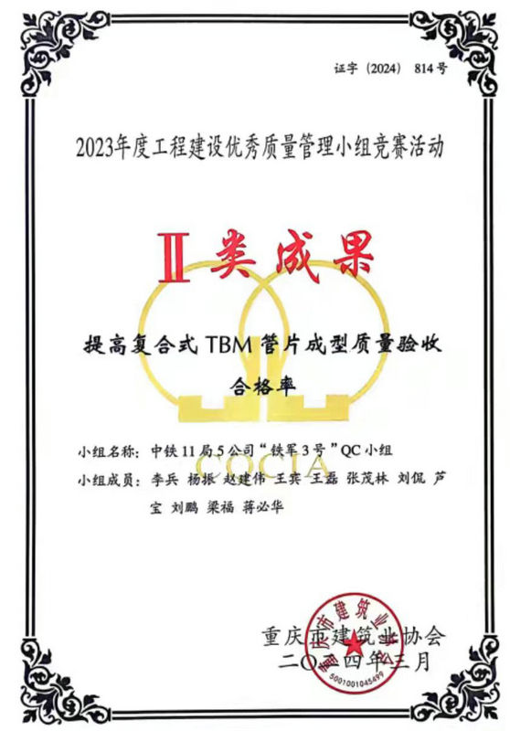 “一股勁”闖難關(guān),體現(xiàn)了項(xiàng)目部領(lǐng)導(dǎo)班子面對困難時(shí)的無畏勇氣和堅(jiān)韌不拔的毅力。軌道交通建設(shè)從來不是一帆風(fēng)順的,15號線18標(biāo)項(xiàng)目也不例外。在施工過程中,復(fù)雜的地質(zhì)條件是第一道難關(guān)。重慶的山地地形使得地下巖層結(jié)構(gòu)多變,有的地方巖石堅(jiān)硬如鐵,盾構(gòu)機(jī)在掘進(jìn)過程中面臨巨大的阻力,刀具磨損嚴(yán)重;而有的地方又土質(zhì)松軟,容易出現(xiàn)塌方的危險(xiǎn)。面對這些難題,領(lǐng)導(dǎo)班子沒有絲毫退縮。他們帶領(lǐng)著技術(shù)團(tuán)隊(duì)深入研究地質(zhì)資料,多次邀請國內(nèi)知名的地質(zhì)專家前來會診。為了解決盾構(gòu)機(jī)刀具磨損問題,他們與設(shè)備制造商密切溝通,嘗試改進(jìn)刀具的材質(zhì)和設(shè)計(jì)。同時(shí),加強(qiáng)對施工現(xiàn)場的監(jiān)測,一旦發(fā)現(xiàn)土質(zhì)松軟的地段,迅速調(diào)整施工工藝,增加支護(hù)結(jié)構(gòu),確保施工安全。除了地質(zhì)問題,管片拼裝質(zhì)量達(dá)到無破損、無滲漏、無錯(cuò)臺標(biāo)準(zhǔn)也是一個(gè)關(guān)鍵問題,為達(dá)到“三無”標(biāo)準(zhǔn)要求,提高質(zhì)量和工效,領(lǐng)導(dǎo)班子鼓勵(lì)技術(shù)人員勇于創(chuàng)新,改進(jìn)管片拼裝工藝,提高了TBM管片成型質(zhì)量驗(yàn)收合格率,該項(xiàng)成果榮獲重慶市市政工程協(xié)會2024年度重慶市市政行業(yè)優(yōu)秀質(zhì)量小組二等獎(jiǎng)、重慶市建筑業(yè)協(xié)會2023年度工程建設(shè)優(yōu)秀質(zhì)量管理小組競賽活動(dòng)II類成果獎(jiǎng)。