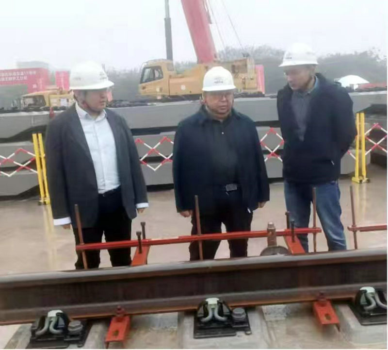 總承包部指揮長(zhǎng)李兵(左2)與19標(biāo)項(xiàng)目軌道工程負(fù)責(zé)人徐新明(左1)、項(xiàng)目經(jīng)理王磊(右1)在鋪軌現(xiàn)場(chǎng)檢查