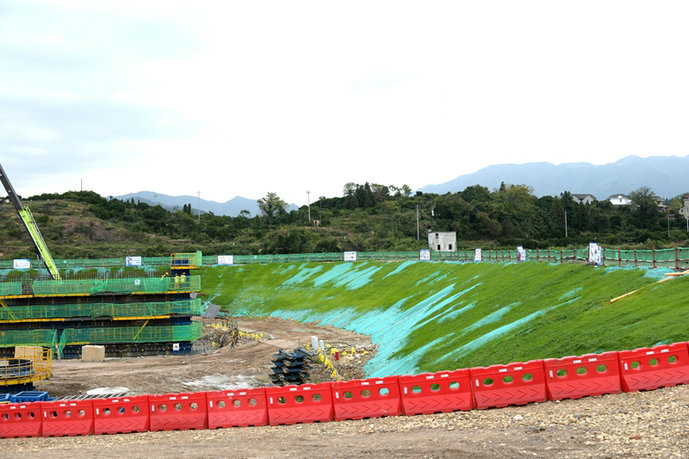 該樞紐開工后,導(dǎo)流墻、泄洪閘與圍堰同步作業(yè),迅速掀起大干高潮,晝夜突擊。為保證該樞紐施工達(dá)到環(huán)保要求,該項(xiàng)目對圍堰內(nèi)側(cè)一面全部掛網(wǎng)種草綠化,局部作噴護(hù)處理,刮大風(fēng)不揚(yáng)塵,江水未受到任何污染,保持綠色施工常態(tài)化。與此同時(shí),將圍堰頂部兩側(cè)安裝鋼管、卡子、綠網(wǎng)構(gòu)成的安全防護(hù)欄,并在立柱上黏貼反光貼,夜間在上面運(yùn)輸材料、轉(zhuǎn)運(yùn)棄土棄渣的車輛和司機(jī)很安全。