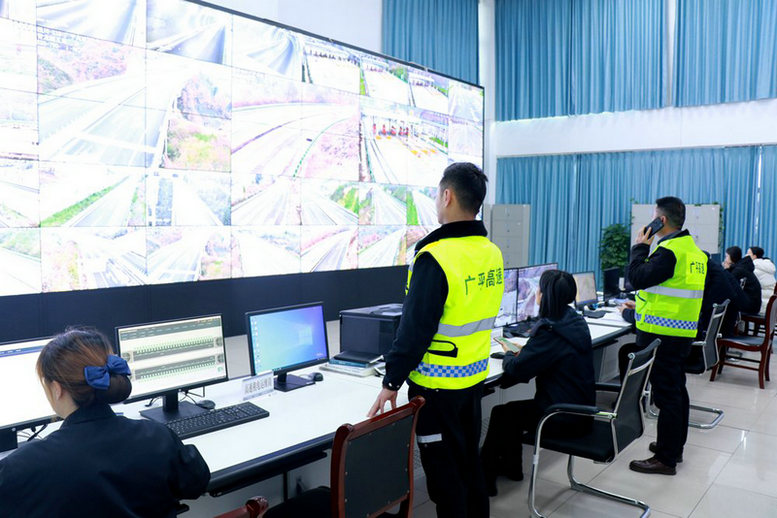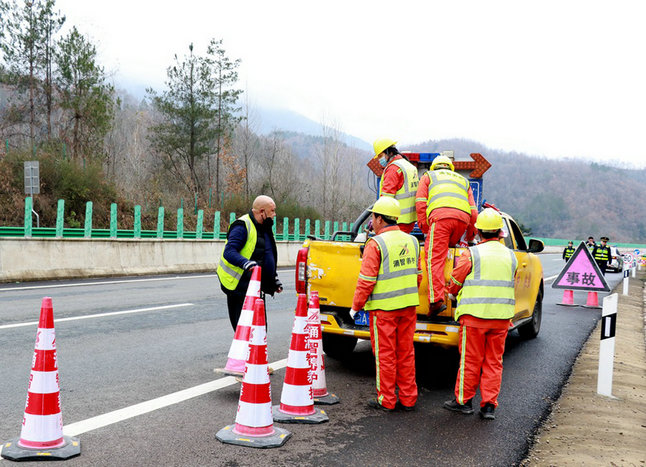 接到報(bào)警電話后,廣平高速監(jiān)控中心立即調(diào)出事故現(xiàn)場畫面,經(jīng)初步研判后啟動應(yīng)急處置預(yù)案;“一路三方”值班領(lǐng)導(dǎo)迅速到達(dá)監(jiān)控中心聯(lián)合指揮,封控、救援、清障等應(yīng)急力量緊急向事故現(xiàn)場開進(jìn)。封控小組先行一步,臨時(shí)封閉高速入口,在事故現(xiàn)場后方設(shè)置警示標(biāo)志,為后續(xù)行動留下安全空間;救援小組按照“先人、再車、后設(shè)施”順序,檢查人員傷亡和車輛、路面設(shè)施受損情況,做好現(xiàn)場應(yīng)急處理和后送醫(yī)院準(zhǔn)備;清障小組到達(dá)后,拖走事故車輛,人工與機(jī)械結(jié)合清理路面積雪結(jié)冰、布撒融雪劑,維修護(hù)欄。