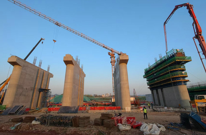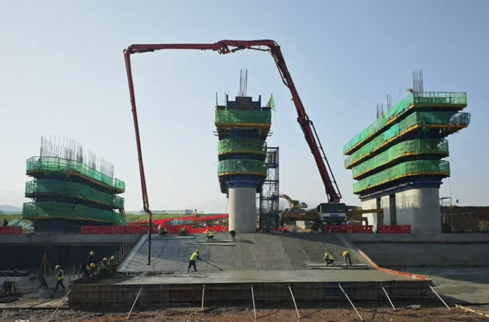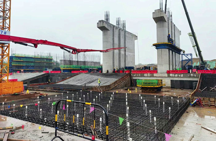 目前正在進行3號泄洪閘墩的首節(jié)布網(wǎng)、模板安裝、澆注混凝土前的準(zhǔn)備工作和2號閘墩底板設(shè)網(wǎng)、立模等工序的推進。導(dǎo)流墻最后一截段將在明年1月上旬完成。