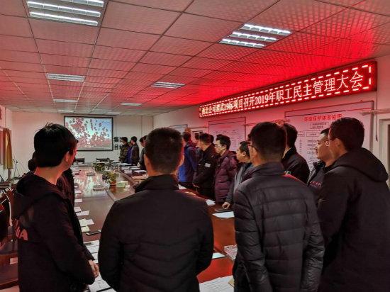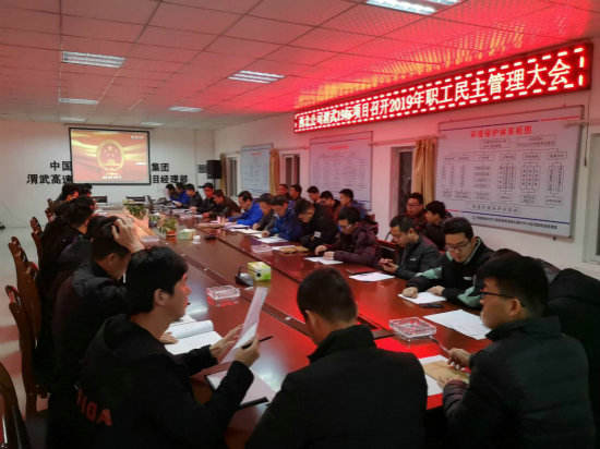 3月6日晚,隨著莊嚴(yán)的國歌聲響起,中國鐵建大橋局西北公司渭武19標(biāo)項(xiàng)目2019年職工民主管理大會(huì)正式拉開序幕,項(xiàng)目領(lǐng)導(dǎo)班子、部門負(fù)責(zé)人、正式職工及特約受邀優(yōu)秀臨時(shí)工代表共39人參加會(huì)議。