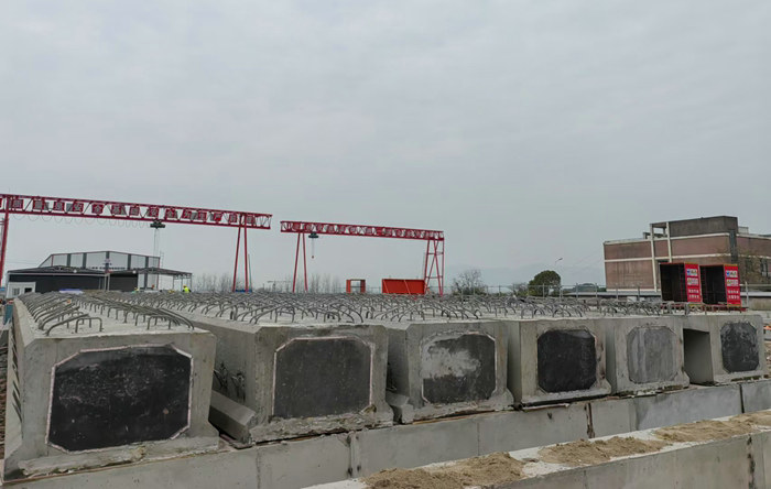 常山江項目制梁場設(shè)在白虎灘樞紐,占地7320平方米,與拌合中心、鋼筋加工場布局為三角形,稱之為“三集場站”。這座制梁場為滿足徐村、富足山等4座大橋架梁需要而設(shè)。從場地平整、碾壓、布網(wǎng)到硬化,僅用一個半月便完成,建成后的梁場布局合理、實用,集生產(chǎn)、存儲與轉(zhuǎn)運(yùn)一體化,分左右區(qū)兩塊,左區(qū)長171米、寬24米,右區(qū)長134米、寬24米,中間是8米寬的車輛運(yùn)輸通道。梁場設(shè)置防排水、電力、消防、空心板梁和T梁臺座、預(yù)制梁、存梁、預(yù)應(yīng)力材料和廢料存放等設(shè)施。梁區(qū)安裝有智能張拉機(jī)、真空壓漿機(jī)、80噸到10噸的龍門吊6臺,定型鋼模板、噴淋養(yǎng)護(hù)系統(tǒng)、配電設(shè)備、視頻監(jiān)控,以及發(fā)電機(jī)等制梁施工所需的各種設(shè)備。常山江項目4座橋梁、招賢閘首橋以及四座樞紐工程的梁板有10多種規(guī)格,長13米—40米,分為空心板梁和T梁,目前設(shè)計數(shù)量共1356片。