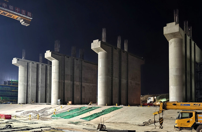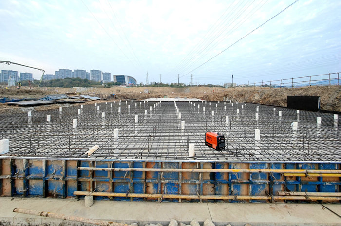 在泄洪閘底板、消力池基礎(chǔ)施工中,該項(xiàng)目動(dòng)用多臺(tái)破碎錘炮擊、挖掘機(jī)與渣土車裝運(yùn),堅(jiān)硬的碎巖、泥巖,從掘進(jìn)深度1米到10多米,一點(diǎn)點(diǎn)攻克,并向縱橫拓展,符合澆注第一層混凝土條件時(shí),分倉(cāng)完成底板、消力池首層“打底”,然后布設(shè)縱橫交錯(cuò)的鋼筋網(wǎng)、從首倉(cāng)到末倉(cāng)依次澆注混凝土。他們采取底板與消力池同步施工,利用長(zhǎng)臂挖掘機(jī)灌注或罐車與泵車配合作業(yè)的辦法,待上一倉(cāng)混凝土強(qiáng)度達(dá)標(biāo),進(jìn)入下一倉(cāng)安裝模具、布網(wǎng)、澆注程序,依次推進(jìn),確保了施工進(jìn)度。