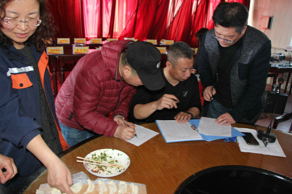 在歡聲笑語中,女工們兩人一組,忙前跑后進行著各項準備工作。為了包餃子的效率,聰明的女工們在正式比賽前各顯其能,想方設(shè)法地把準備工作做得細致到位。隨著王輝宣布比賽開始,13組參賽人員立即快速地包餃子。經(jīng)過三分鐘的計時比賽,經(jīng)評審組的認真評審,高艷與趙娜的組合以數(shù)量、品相等優(yōu)勢奪得了包餃子比賽第一名,緊隨其后的王麗與王瑤組合、蔣建新與孫鑫組合分獲第二和第三名。