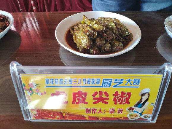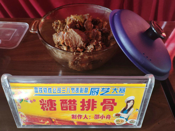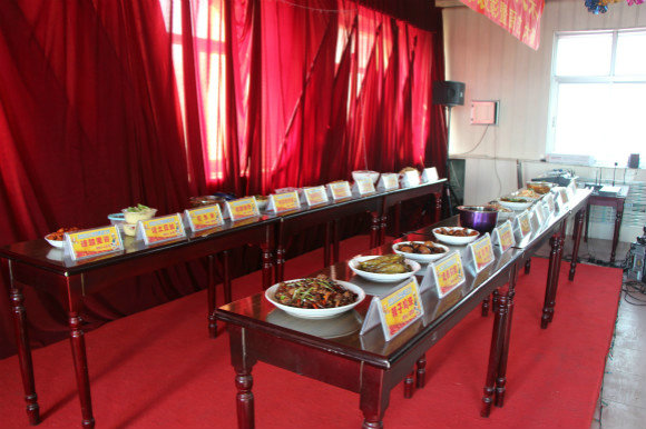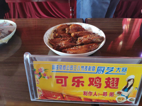 在緊張的包餃子比賽結(jié)束后,馬上進行了女工廚藝大賽。由于場地等條件的限制,現(xiàn)場展示的均為參賽女工頭天晚上在家精心制作的菜品。展示的各色菜品花樣繁多,冷菜熱菜各具特色。經(jīng)評委們在色、香、味等多方面認真地品評,觀看女工們頭天晚上在家精心制作菜品過程的錄像,最后制作“可樂雞翅”的鄧娜勝出,斬獲了第一。邵小舟制作的“糖醋排骨”和梁薇制作的“虎皮尖椒”緊隨其后獲得了第二和第三名。