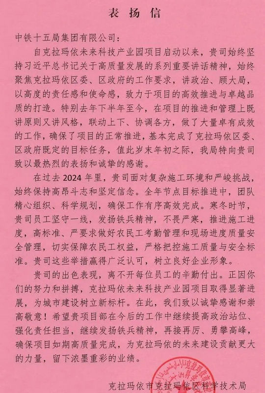 鐵路工程建設(shè)網(wǎng)訊 (通訊員 王詩(shī)迪)近日,中鐵十五局新疆克拉瑪依未來(lái)科技產(chǎn)業(yè)園項(xiàng)目收到克拉瑪依區(qū)科學(xué)技術(shù)局發(fā)來(lái)的的表?yè)P(yáng)信。