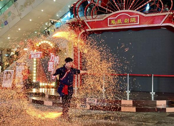 活動(dòng)現(xiàn)場(chǎng)包含了新春特別版節(jié)目演繹和非遺火舞表演?;鸢?、火棍、火流星、鐵飛花等精彩演出在夜空中劃出優(yōu)美的弧線,舞者們矯健的身姿與火焰完美融合,給游客帶來了視覺與文化的雙重震撼,現(xiàn)場(chǎng)游客紛紛拿出手機(jī)拍照打卡,記錄了這難忘的瞬間。