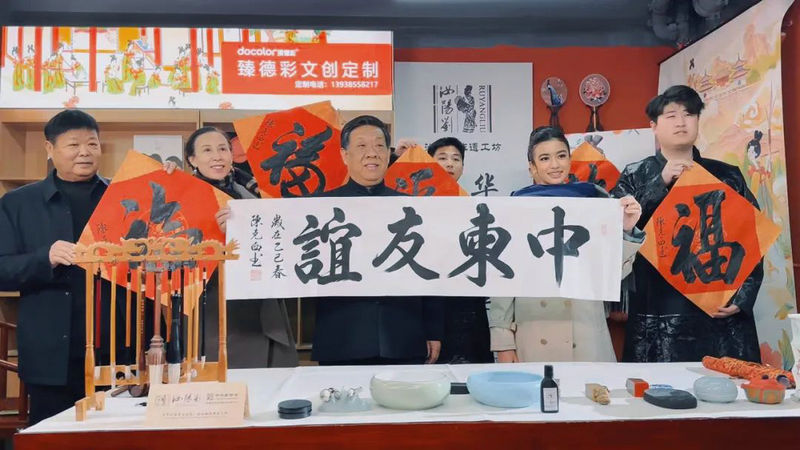 在中鐵·泰和里唐宋夢華主題街區(qū),珍娜公主沉浸式體驗(yàn)了中華文化的博大精深。實(shí)景演出《入夜禮》莊重典雅的盛世迎客舞令她贊嘆不已。隨后,珍娜公主參觀了老字號(hào)非遺項(xiàng)目--汝陽劉毛筆博物館,與館長共同揮毫潑墨,共同書寫“中柬友誼”。
