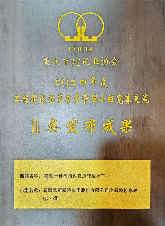 近日,從重慶市建筑業(yè)協(xié)會(以下簡稱“重慶建協(xié)”)傳來喜訊,北新路橋集團(tuán)西安分公司內(nèi)江鄉(xiāng)村水務(wù)示范縣建設(shè)項(xiàng)目申報(bào)的《研制一種溝槽內(nèi)管道轉(zhuǎn)運(yùn)小車》QC成果憑借創(chuàng)新的技術(shù)應(yīng)用、扎實(shí)的實(shí)踐成效和突出的行業(yè)價(jià)值,在2024年度重慶市工程建設(shè)質(zhì)量管理小組活動成果評選中脫穎而出,榮獲“一類成果獎”與“二類發(fā)布成果獎”兩項(xiàng)殊榮。
