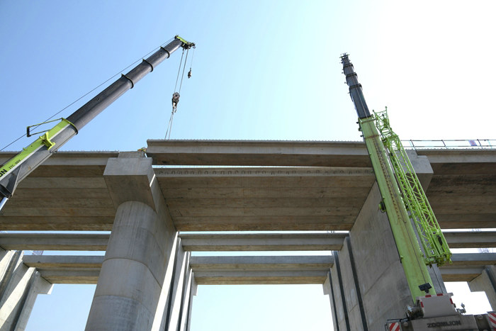 兩臺(tái)吊車合力架梁 郝偉亮攝