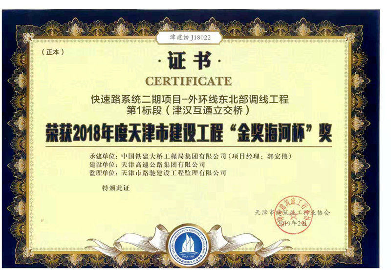 近日,中國鐵建大橋工程局集團三公司天津外環(huán)項目領取了天津市建筑施工行業(yè)協(xié)會頒發(fā)的2018年度天津市建設工程“金獎海河杯”,這是三公司首次獲得這一獎項。