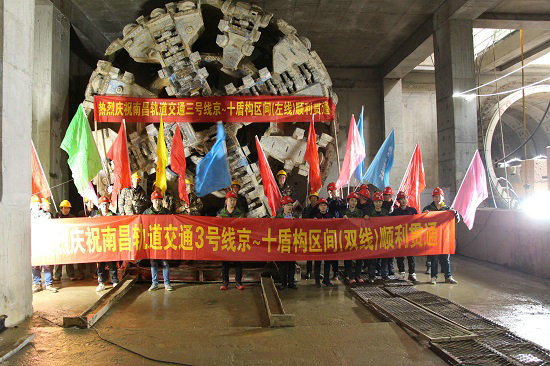 3月22日,在中鐵建大橋局一公司施工的南昌地鐵3號線的京家山站現(xiàn)場,隨著兩層樓高的盾構(gòu)機(jī)刀盤緩緩擊破洞門,“中鐵490#”盾構(gòu)機(jī)破土而出,南昌地鐵3號線京家山站~十字街站區(qū)間左線順利實現(xiàn)貫通,此區(qū)間右線已于今年1月份貫通,至此,該標(biāo)段三個盾構(gòu)區(qū)間中一個實現(xiàn)雙線貫通。