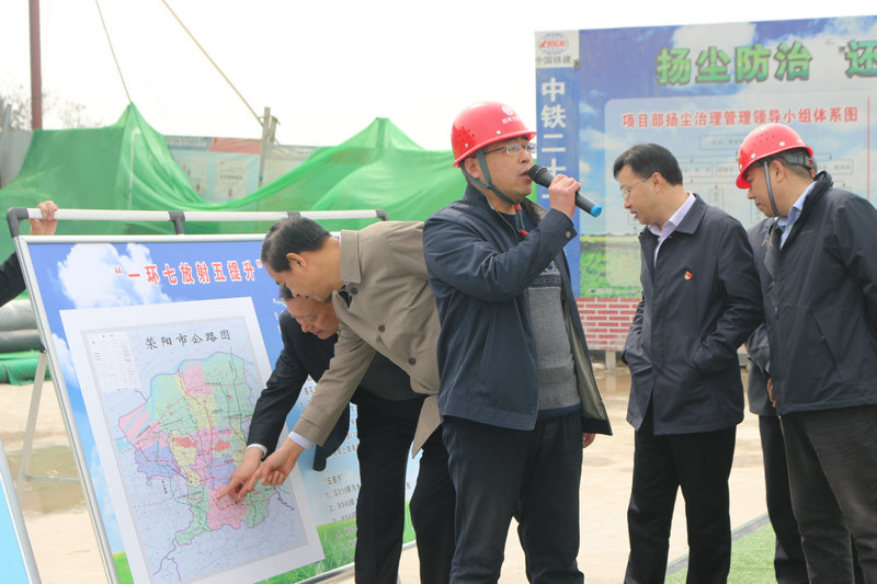 本網(wǎng)河南滎陽3月31日訊(通訊員 劉曉)3月29日上午,滎陽市市委書記宋書杰、人大主任張淑霞、政協(xié)副主席范勝利一行在市交通運輸局黨組書記、局長杜文杰等領(lǐng)導(dǎo)的陪同下,前往滎陽中鐵二十一局三公司G234項目部工地視察。陪同視察的還有鄭州交通建設(shè)投資有限公司總經(jīng)理韓樹國,鐵建中原公司黨委副書記、總經(jīng)理馬威、監(jiān)理單位以及G234公路改建項目部黨工委書記李凱、常務(wù)副經(jīng)理郭東峰等。另外,鄭州G310兄弟項目技術(shù)人員也到現(xiàn)場參觀學(xué)習(xí)。 上午9時30分,四輛大巴車緩緩駛?cè)肴f山隧道出口,30多名來自滎陽市委市政府及人大、政協(xié)領(lǐng)導(dǎo)齊聚在項目標(biāo)準(zhǔn)化建設(shè)展示區(qū),參建員工熱烈鼓掌歡迎各位領(lǐng)導(dǎo)檢查工作,宋書記等領(lǐng)導(dǎo)與大家親切握手。市領(lǐng)導(dǎo)詳細了解了施工區(qū)揚塵治理防塵設(shè)施標(biāo)準(zhǔn)配備、安全質(zhì)量管理制度執(zhí)行落實力度和拌合站、鋼構(gòu)件加工場等區(qū)域建設(shè)標(biāo)準(zhǔn)以及施工人員安全、防塵作業(yè)等情況;接著,市交通局長杜文杰為大家講解了滎陽市“一環(huán)七放射五提升”的交通發(fā)展思路。宋書記聽到關(guān)鍵處,走到展板前,指著滎陽市公路圖,就國道234項目線路規(guī)劃的重要性和戰(zhàn)略性與在場領(lǐng)導(dǎo)進行了進一步交流、詢問了項目施工進度,并對項目標(biāo)準(zhǔn)化建設(shè)給予了高度評價,同時,要求項目按照標(biāo)準(zhǔn)不遺余力的抓好揚塵污染治理工作,攻克萬山、守住青山,建“惠民工程、利民工程”。