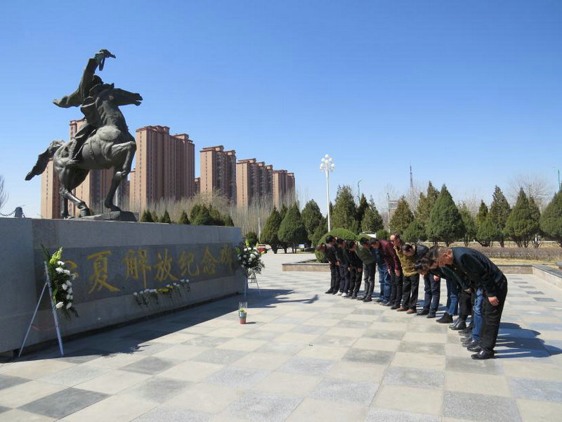 在寧夏解放紀念碑前,大家一同瞻仰了革命烈士雕像,在了解了革命先烈的英雄事跡后,全體黨員向烈士雕像敬獻了鮮花并默哀三分鐘,表達對革命烈士的緬懷和崇高敬意。最后,全體黨員在寧夏解放紀念牌前再一次重溫了入黨誓詞并在黨員倡議書上許下了自己的承諾。洪亮的聲音環(huán)繞在廣場之上,大家仿佛回到了入黨時第一次宣讀誓詞的時候,心情無比激動。
