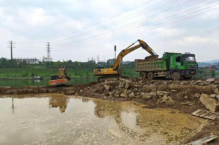 晚飯后,突擊隊(duì)員再次直奔現(xiàn)場完成圍堰加厚、加高任務(wù),經(jīng)過近10個(gè)小時(shí)的艱苦奮戰(zhàn),圍堰加高兩米多,暴漲的洪水無無法撼動(dòng)圍堰,無一處潰堤。其次,動(dòng)用多臺(tái)大功率抽水設(shè)備對(duì)圍堰內(nèi)的大量積水外排,為晴天施工創(chuàng)造條件。
