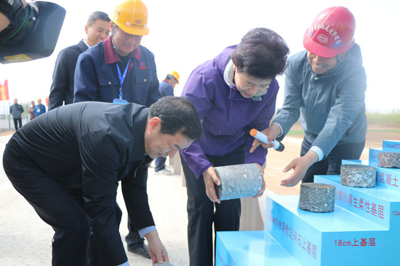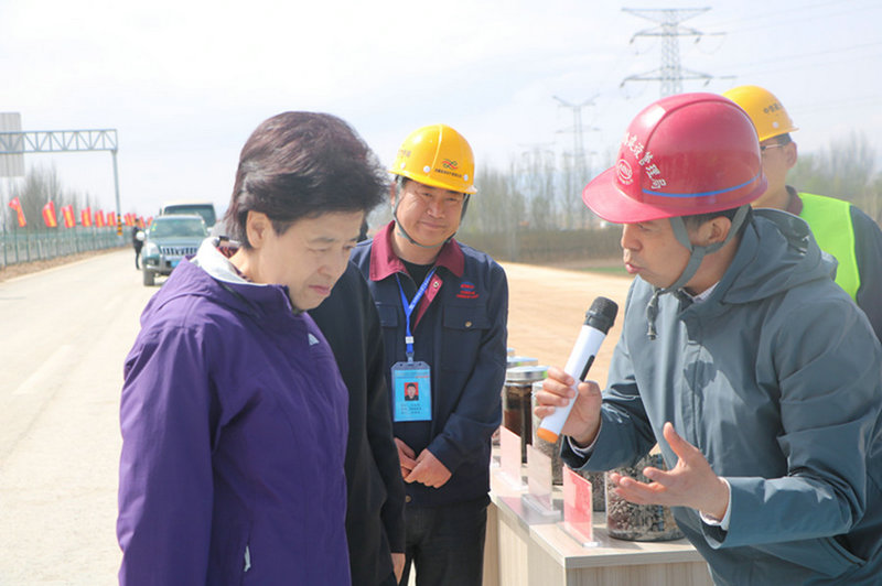 在施工現(xiàn)場(chǎng),咸輝主席、張超超常務(wù)副主席聽(tīng)取了京藏高速寧夏境內(nèi)全線建設(shè)情況以及中國(guó)鐵建大橋局西北公司承建的京藏高速JZ21標(biāo)工程建設(shè)情況,仔細(xì)了解設(shè)計(jì)、施工、交通分流等情況,饒有興趣地了解了路面原材料樣品、路面7層結(jié)構(gòu)層芯樣,并查看了路基路床的拼接施工等。