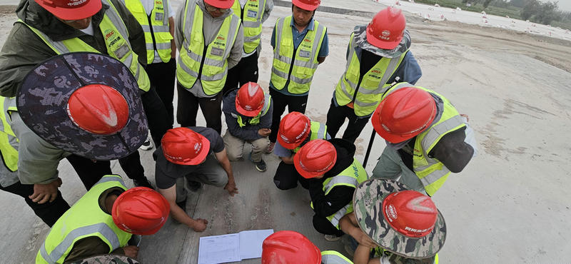 理論沉一線,破解技術(shù)堵點(diǎn)。項(xiàng)目將課堂搬到施工前沿,開展“圖紙+現(xiàn)場+問題”三位一體教學(xué)。在橋涵過渡段,技術(shù)負(fù)責(zé)人演示“壓實(shí)度分層測控法”,精準(zhǔn)控制攤鋪與碾壓參數(shù),消除“橋頭跳車”隱患;路面作業(yè)區(qū)里,技術(shù)人員邊學(xué)水穩(wěn)層配比理論,邊實(shí)操攤鋪校準(zhǔn)與碾壓調(diào)試,掌握“毫米級”精度;塔里木河特大橋現(xiàn)場,技術(shù)人員認(rèn)真記錄要點(diǎn),形成“學(xué)、看、解”閉環(huán)。