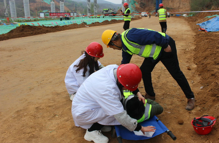 本次應(yīng)急救援活動共分六個小組,分別是通訊聯(lián)絡(luò)組、后勤保障組、緊急疏散組、搶險救援組、現(xiàn)場警戒組、醫(yī)療救護(hù)組。演練開始前,雷總召集應(yīng)急救援小組相關(guān)人員召開專題預(yù)備會議,說明本次組織演練活動的目的、意義、要求并分配了工作任務(wù)。各小組準(zhǔn)備就緒,等待指令?,F(xiàn)場模擬的是徐老莊互通橋G匝道施工現(xiàn)場有一名施工人員不慎從橋墩墜落,傷勢不明,請求支援?,F(xiàn)場接到指令后,根據(jù)《高空墜落應(yīng)急救援演練方案》,項(xiàng)目部立即啟動應(yīng)急救援,副指揮長隨即撥打市120急救中心電話,醫(yī)療救護(hù)組人員迅速準(zhǔn)備擔(dān)架、急救箱等醫(yī)療設(shè)備趕往事故現(xiàn)場,對其受傷的右腿及頭部傷口進(jìn)行處理;現(xiàn)場警戒組在現(xiàn)場拉起警戒線,開始疏散圍觀人群;搶險救援組隨即進(jìn)入,清理周邊材料,避免二次傷害;隨后,緊急疏散組及時到達(dá)現(xiàn)場,疏通救援通道,引導(dǎo)救護(hù)車輛進(jìn)入事故現(xiàn)場;通訊聯(lián)絡(luò)組及后勤保障組保持通訊通暢,配合現(xiàn)場救援。各小組配合默契、處理得當(dāng)、反應(yīng)迅速,圓滿的完成了救援任務(wù)。15時35分,演練結(jié)束,各小組成員返回指揮中心。