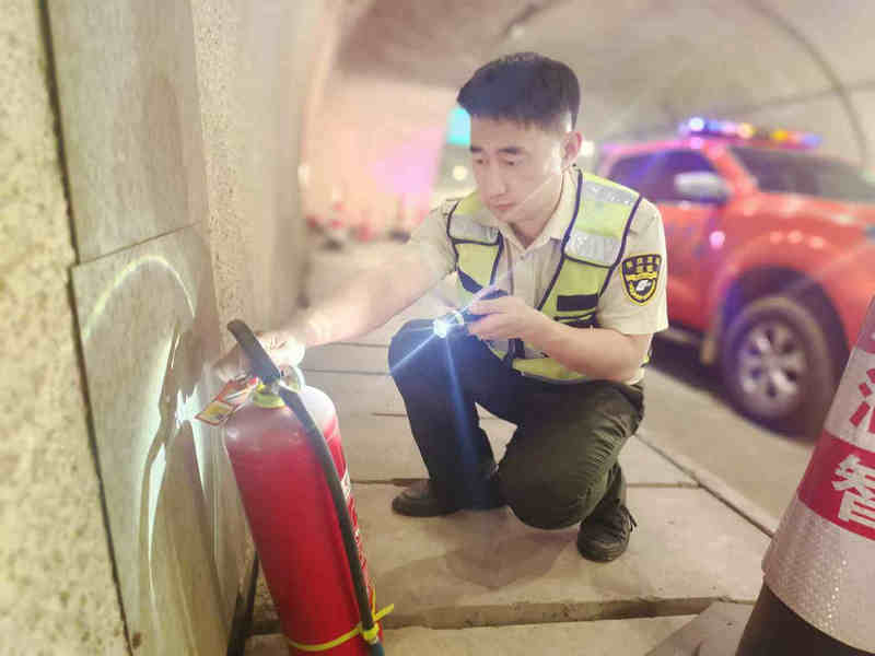 路巡人員正在檢查隧道內(nèi)消防設(shè)施