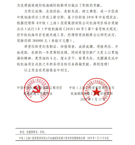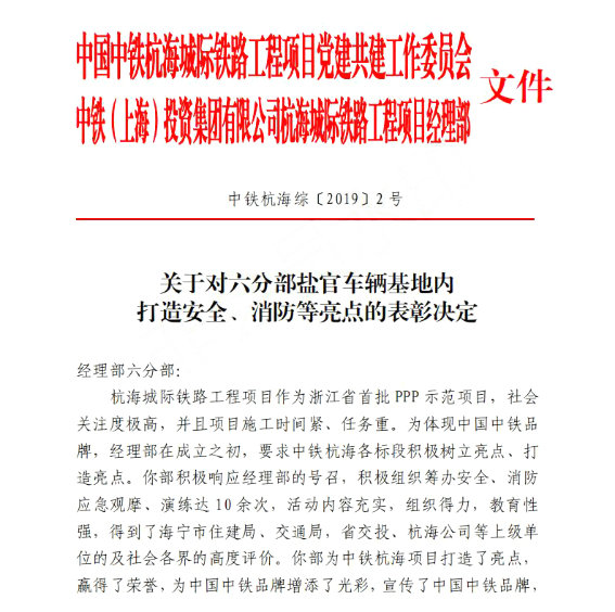 ?。ê幱崳?月19日,中鐵一局建安公司杭海城際項目部收到由中鐵(上海)投資集團有限公司杭海城際項目部發(fā)來的表彰信。就中鐵一局建安公司承建的杭海城際項目部在安全、消防兩方面的良好表現(xiàn)予以表彰。 作為浙江省首批 PPP 示范項目,杭海城際鐵路工程項目社會關(guān)注度高、施工時間緊、任務重。項目部嚴格落實中鐵(上海)投資集團有限公司杭海城際項目部提出的樹立和打造亮點要求,在安全、消防工作中狠下功夫,重視培訓教育,嚴格現(xiàn)場監(jiān)督,先后組織籌辦安全、消防應急觀摩、演練10余次,發(fā)揮了良好的教育和社會效應,得到了海寧市住建局、交通局,省交投以及杭海公司等社會各界的高度評價,為中國中鐵品牌增光添彩做出了積極貢獻。 下一步,項目部將繼續(xù)秉承“聚焦要點,抓綱帶目”的工作要求,嚴守安全生產(chǎn)質(zhì)量關(guān),夯實廉政之基,完善標準化建設(shè),強化管理體系打好2019年收關(guān)之戰(zhàn)。