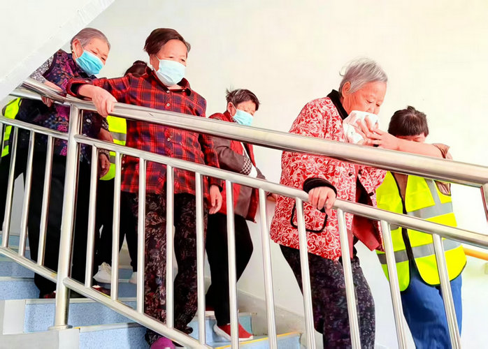 圖3為:在“雙節(jié)”逃生應(yīng)急演練中,該院應(yīng)急疏散組成員、護理員,正在按照消防火災(zāi)逃生預案,有序地組織長者撤離到安全地點。