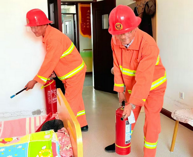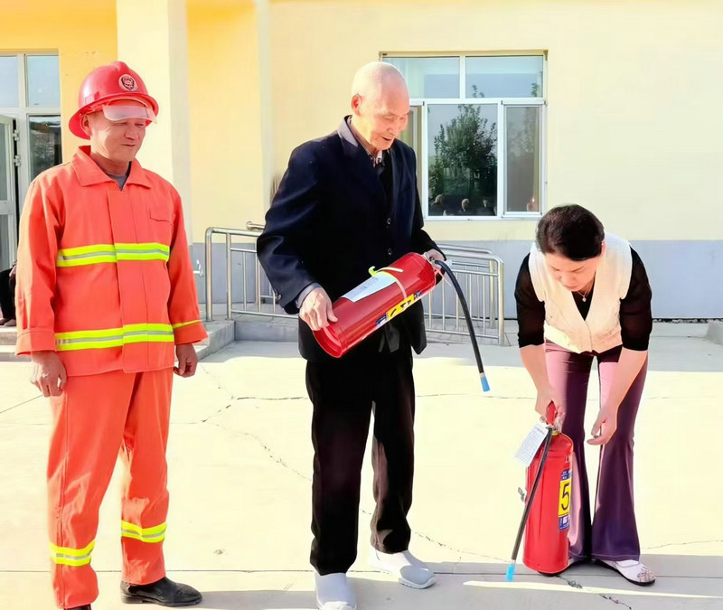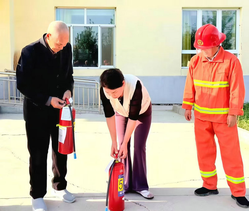 圖2為:六師奇臺110社區(qū)吾家樂寶養(yǎng)老院院長史云智(左二),在開展“雙節(jié)”消防逃生應(yīng)急演練滅火器實際操作培訓中,正在檢查干粉滅火期是否完好。