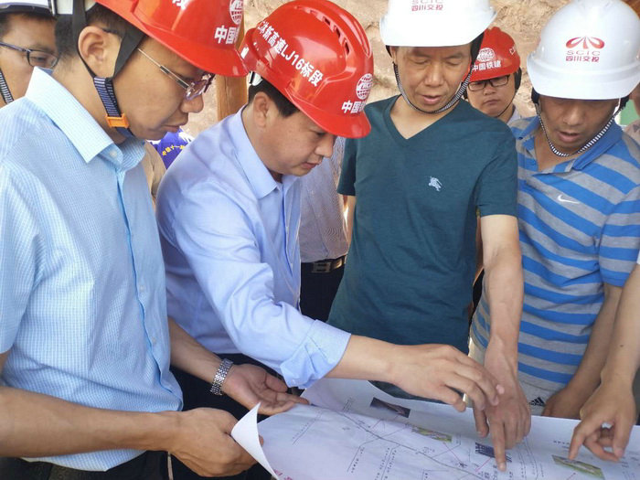 圖為莊董事長(左二)與仁沐高速董事長劉勇(右二)、項目負責(zé)人查看施工圖紙 劉勇董事長在聽取項目負責(zé)人匯報及與莊董事長交流后,在肯定LJ16標段前期準備工作時,提出三點要求:一是項目規(guī)劃一定要合理適用,特別是鋼筋加工場的布設(shè)一定要詳盡,確保形成流水作業(yè);二是要確保臨建設(shè)施選址安全,避免洪水及滑坡等地質(zhì)災(zāi)害導(dǎo)致后期施工人員及財產(chǎn)受損;三是要注意現(xiàn)場文明施工,避免因施工導(dǎo)致環(huán)境污染情況的發(fā)生。