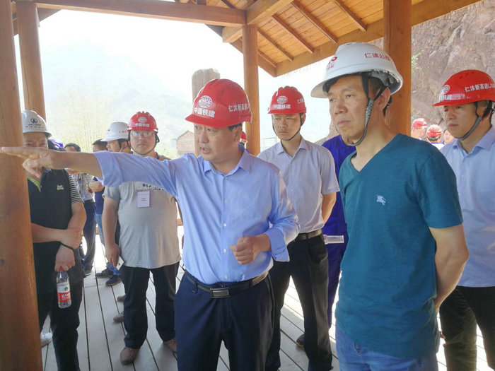 莊乾理(中)在現(xiàn)場向劉勇董事長(右二)介紹工地情況