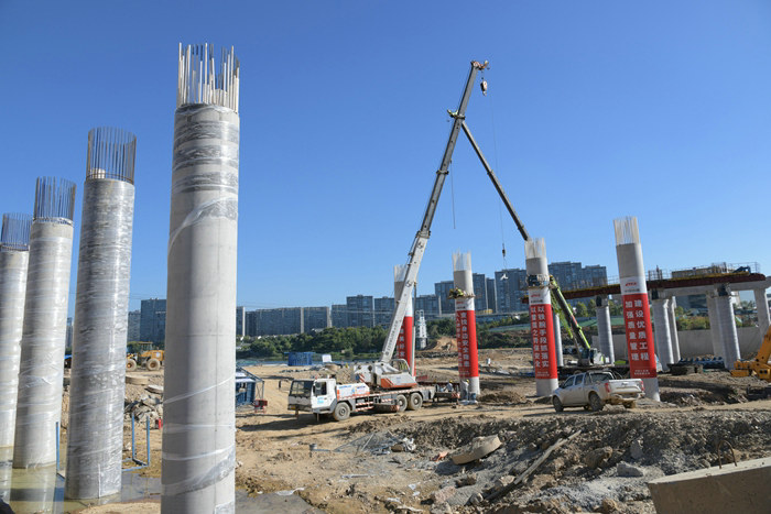 富足山舊橋位于城區(qū)文峰路上,全長300米、寬18米、高19米,運行30年,是常山縣33.6萬人出行,與杭州、江西上饒等地密切聯(lián)系的重要通道,被當?shù)厝朔Q為民生橋。新建富足山大橋在舊橋原址上,與天馬樞紐泄洪閘相距約30米,橋墩和橋面橫跨導流墻。該橋全長376.8米、11垮、高19米、寬27.5米,直徑1.5—1.8米的樁基46根,直徑1.7米的墩柱42個,9、10垮為通航通道,上部為T梁結(jié)構(gòu),橋面兩側(cè)各增加2.75米寬的人行道和3米寬的非機動車道。2024年11月開工建設(shè)。該項目在樁基施工中,利用冬春雨水少的特點,從兩端向中間推進,為橋墩施工創(chuàng)造了條件。今年汛期過后,項目部建起一座100多米長的漫水橋,右側(cè)5排20根墩柱和蓋梁完成后,填筑起一座6米多高的圍堰,將常山江水改變流向,從完工的墩柱位置流過,抽干左側(cè)河道的積水,組織人力和機械進行樁基施工。在墩柱施工中,采取在破樁頭后的樁基上綁扎鋼筋籠、安裝定型鋼模、一次性灌注的辦法,使拆模后的墩身顏色一致、光潔如玉,受到業(yè)主、監(jiān)理單位的好評。