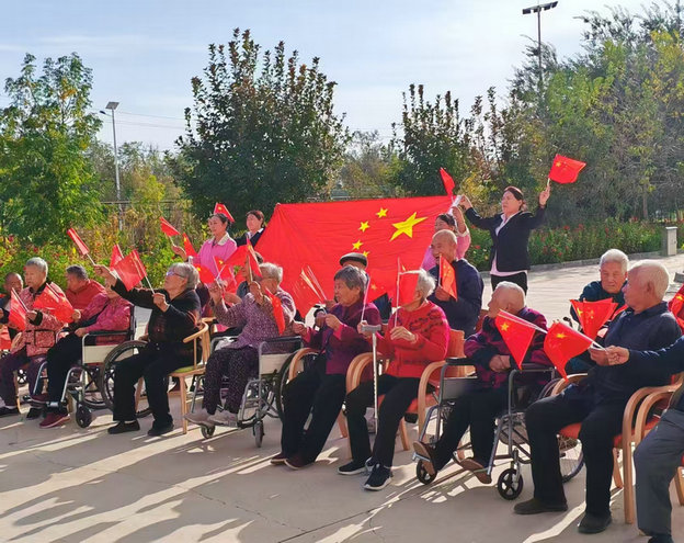 奇臺(tái)訊:(通訊員 王學(xué)明 報(bào)道)9月27日周末下午,時(shí)值國慶及中秋佳節(jié)前夕,第六師奇臺(tái)110社區(qū)吾家樂寶養(yǎng)老院內(nèi),陽光明媚,秋高氣爽。為表達(dá)對(duì)偉大祖國和大美新疆的熱愛之情,該院的長(zhǎng)者及員工們,手舞鮮艷的國旗,用自己的真實(shí)情感,認(rèn)真開展了“高歌頌黨恩 傾心愛中華”活動(dòng)。