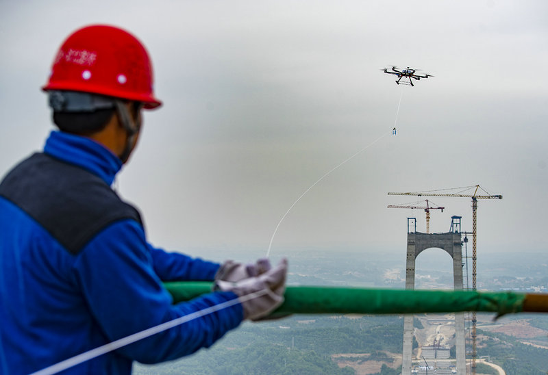 此次先導(dǎo)索采用直徑2.0毫米、長(zhǎng)1760米的高強(qiáng)度高韌性杜邦絲,由GPS自控導(dǎo)航式無(wú)人機(jī)攜帶,待起飛指令發(fā)出后,“飛手”操控?zé)o人機(jī)從南索塔156米高的塔頂起飛,飛躍1038米寬的長(zhǎng)江,歷經(jīng)5分鐘,飛至北索塔148米的主塔塔頂,成功連接長(zhǎng)江兩岸。先導(dǎo)索過(guò)江完成后,將以此索為基礎(chǔ),采用“小繩拉大繩”方式,通過(guò)來(lái)回8次拖拽,逐漸增加鋼繩重量,形成貓道主牽引系統(tǒng),最后進(jìn)行貓道的安裝與主纜索股架設(shè)施工。