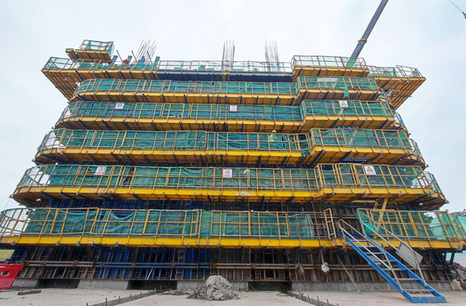 該公司承建的常山江航電項(xiàng)目由4座樞紐、4座大橋、1座大壩、4座電站、4處錨地、1個(gè)服務(wù)區(qū)、982萬(wàn)立方土石方、河道疏浚、綠化、拆除1座舊電站等構(gòu)成。招賢樞紐是常山江項(xiàng)目4座樞紐中最大的樞紐,2023年9月開(kāi)工,主要工程為:導(dǎo)流墻、應(yīng)急過(guò)船設(shè)施、船閘、泄洪閘、電站、大壩、跨江閘首橋和人行天橋。其中泄洪閘共17個(gè)閘墩,每個(gè)閘墩高17.3米、長(zhǎng)18.5米、寬2.6米,閘墩間距14米,閘門(mén)高7.5米。前期,該樞紐采取筑圍堰、打旋噴樁、挖基坑,澆注底板、閘墩,安全、優(yōu)質(zhì)、高效地完成了泄洪閘9個(gè)閘墩,為二期施工打好了基礎(chǔ)。