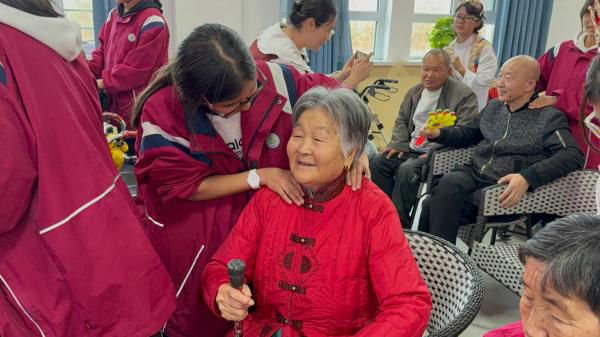 在親切的嘮家常環(huán)節(jié),學(xué)生們圍坐在長(zhǎng)者身旁,傾聽他們講述過去的故事,分享生活中的趣事。一張張笑臉、一聲聲問候,讓整個(gè)養(yǎng)老院都沉浸在溫馨和睦的氛圍里,也讓長(zhǎng)者們?cè)谥仃?yáng)佳節(jié)感受到了如同家人般的陪伴與關(guān)愛。