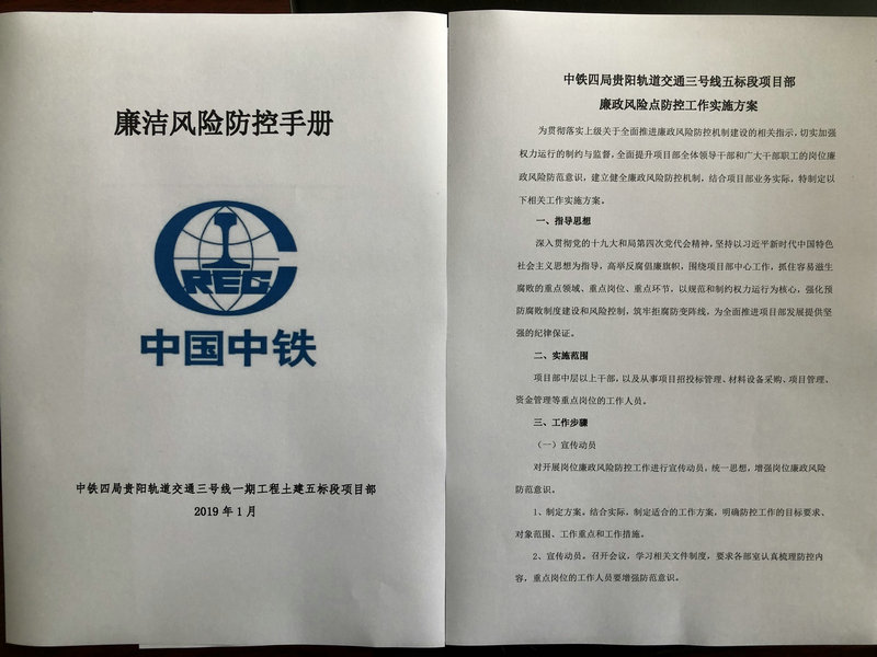 項目部編制了《廉潔風險防控手冊》,制定了具體實施方案,重點圍繞各部室廉政風險多發(fā)易發(fā)的重點環(huán)節(jié)進行了排查,重點完善和建立相關制度,加強制度措施的過程監(jiān)督,對照崗位職責,從權力制約、民主監(jiān)督等方面入手,有針對性地制定和完善廉政風險防控措施,使各項措施切實可行,確保各項措施真正落到實處。