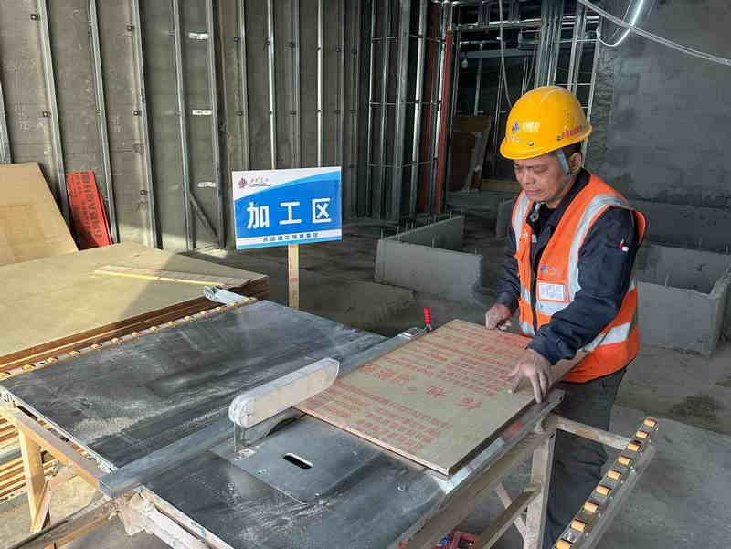 和粉塵,既影響施工人員呼吸健康,又散落覆蓋設(shè)備與地面,導致現(xiàn)場臟亂、清理耗時,更因木屑易燃多次被列為消防隱患。為從源頭解決問題,該項目部團隊立足實際需求,巧妙加裝鋸末回收吸塵裝置,結(jié)合設(shè)備結(jié)構(gòu)實際,創(chuàng)新將吸塵點設(shè)置在臺鋸下方,鋸片工作區(qū)域的底部出料口處是鋸末拋出的主要通道,通過在臺鋸底座加裝金屬導流槽,將切割產(chǎn)生的碎屑直接導入下方連接的耐磨橡膠管道,再由工業(yè)吸塵器負壓抽吸至防靜電集塵袋中,實現(xiàn)“切在哪,吸在哪”的高效回收。而上方則保留原有鋸片防護罩,兼具安全防護與防塵隔離功能,避免操作人員受到機械傷害,同時減少粉塵向上擴散。“現(xiàn)在切板子灰塵少,眼睛不刺撓,地上也干凈。”現(xiàn)場的木工師傅說道。該裝置不僅改善了木工作業(yè)區(qū)環(huán)境,更體現(xiàn)了項目團隊從細節(jié)處求突破的精益管理思路。下一步,該事業(yè)部將持續(xù)鼓勵一線人員立足現(xiàn)場,以更多“巧思”推動施工管理提質(zhì)增效。