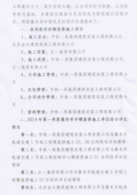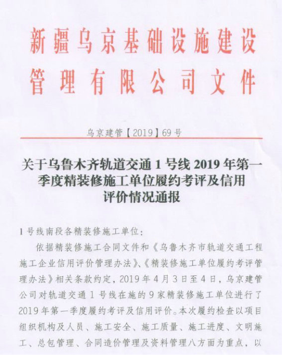 近日,在本次檢查的9家精裝修施工單位中,中鐵一局建安公司烏魯木齊軌道交通1號線精裝修03、08合同段項目榮獲季度綜合考評第一名,1號線控制中心裝修01合同段項目榮獲綜合考評第二名。新疆烏京基礎(chǔ)設(shè)施建設(shè)管理有限公司發(fā)布了烏魯木齊軌道交通1號線南段精裝修施工單位2019年第一季度履約考評及信用評價結(jié)果。 中鐵一局建安公司烏魯木齊軌道 1號線精裝修03、08合同段負(fù)責(zé)施工烏魯木齊1號線南段二道橋站、新疆大學(xué)站和王家梁站的公共區(qū)精裝修;1號線控制中心裝修01合同段負(fù)責(zé)施工烏魯木齊軌道交通產(chǎn)業(yè)總部基地控制中心A、D座室內(nèi)精裝修施工。項目部在現(xiàn)場施工條件不利因素下,積極策劃,主動同各方溝通爭取作業(yè)面和作業(yè)時間,在人員、機(jī)械和材料上加大投入,確保施工進(jìn)度不受影響;同時積極開展圖紙研討,加強(qiáng)現(xiàn)場施工人員安全、技術(shù)培訓(xùn),建立項目質(zhì)量管理體系,不斷在做實做細(xì)上下功夫。在本次考評中,業(yè)主對項目部在施工安全、進(jìn)度管控、文明施工、總包管理、合同造價管理和資料管理等六個方面的工作進(jìn)行了表揚。 下一步,項目部將繼續(xù)提高施工管理人員思想意識,嚴(yán)格管理要求,樹立大局意識,鼓足干勁克服困難,加強(qiáng)安全,控制質(zhì)量,加快推進(jìn)施工進(jìn)度,爭取在二季度考評中再創(chuàng)輝煌。
