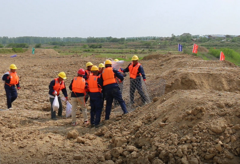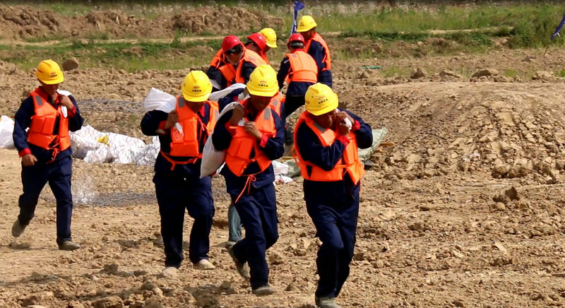 按照演練預案,由于近日連降暴雨,1號導流明渠河水上漲,部分施工區(qū)域有塌壩現(xiàn)象。在得到緊急通知后,項目部防洪度汛指揮中心命令各單位立即啟動應急響應,物資設備組、搶險救援組、醫(yī)療救護組、現(xiàn)場保衛(wèi)組等8組搶險救援人員立即展開行動?,F(xiàn)場保衛(wèi)組組織人員撤離,現(xiàn)場安全撤離4人,1人不慎落水,保衛(wèi)組封鎖危險區(qū)域,救援組進場施救落水人員,物資設備組提前聯(lián)系救護車到指定地點,待落水人員安全救出后,醫(yī)療救護組及時施救并立即送往醫(yī)院救治,觀測到河渠水位有繼續(xù)上漲趨勢,搶險組接到命令加固河堤,此時發(fā)現(xiàn)一處河岸沖刷嚴重,搶險組立即組織挖機裝填片石籠對此處進行加固,加固完成后將機械設備安全轉(zhuǎn)移出危險區(qū)域,整個演練過程按預定方案圓滿完成。
