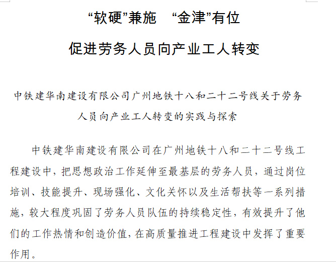 近日,從中國施工企業(yè)管理協(xié)會(huì)《關(guān)于推廣 2025 年工程建設(shè)企業(yè)文化建設(shè)》系列活動(dòng)成果的通知(中施企協(xié)2025第85號(hào)文件)中獲悉,中鐵建華南建設(shè)有限公司廣州市軌道交通十八和二十二號(hào)線總承包部兩項(xiàng)成果獲得2025年度企業(yè)文化建設(shè)成果一等獎(jiǎng),段緒江撰寫的論文《關(guān)于勞務(wù)人員向產(chǎn)業(yè)工人轉(zhuǎn)變的探索與實(shí)踐》獲得中國施工企業(yè)管理協(xié)會(huì)2025年度企業(yè)文化建設(shè)實(shí)踐案例成果一等獎(jiǎng),創(chuàng)作的美術(shù)作品《云深不知處,天路向陽開》同步獲得繪畫競賽成果一等獎(jiǎng)。