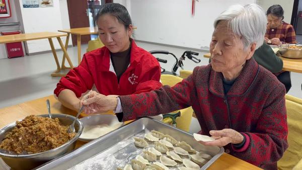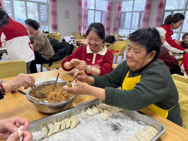 活動現(xiàn)場暖意融融,圍在桌前分工協(xié)作,取皮、填餡、捏合,一個個圓潤飽滿的餃子很快便擺滿了托盤。大家一邊忙活,一邊圍在老人身旁閑話家常,聽老人們講述新湖農(nóng)場的發(fā)展變遷與往昔歲月,歡聲笑語回蕩在養(yǎng)老院的每個角落。